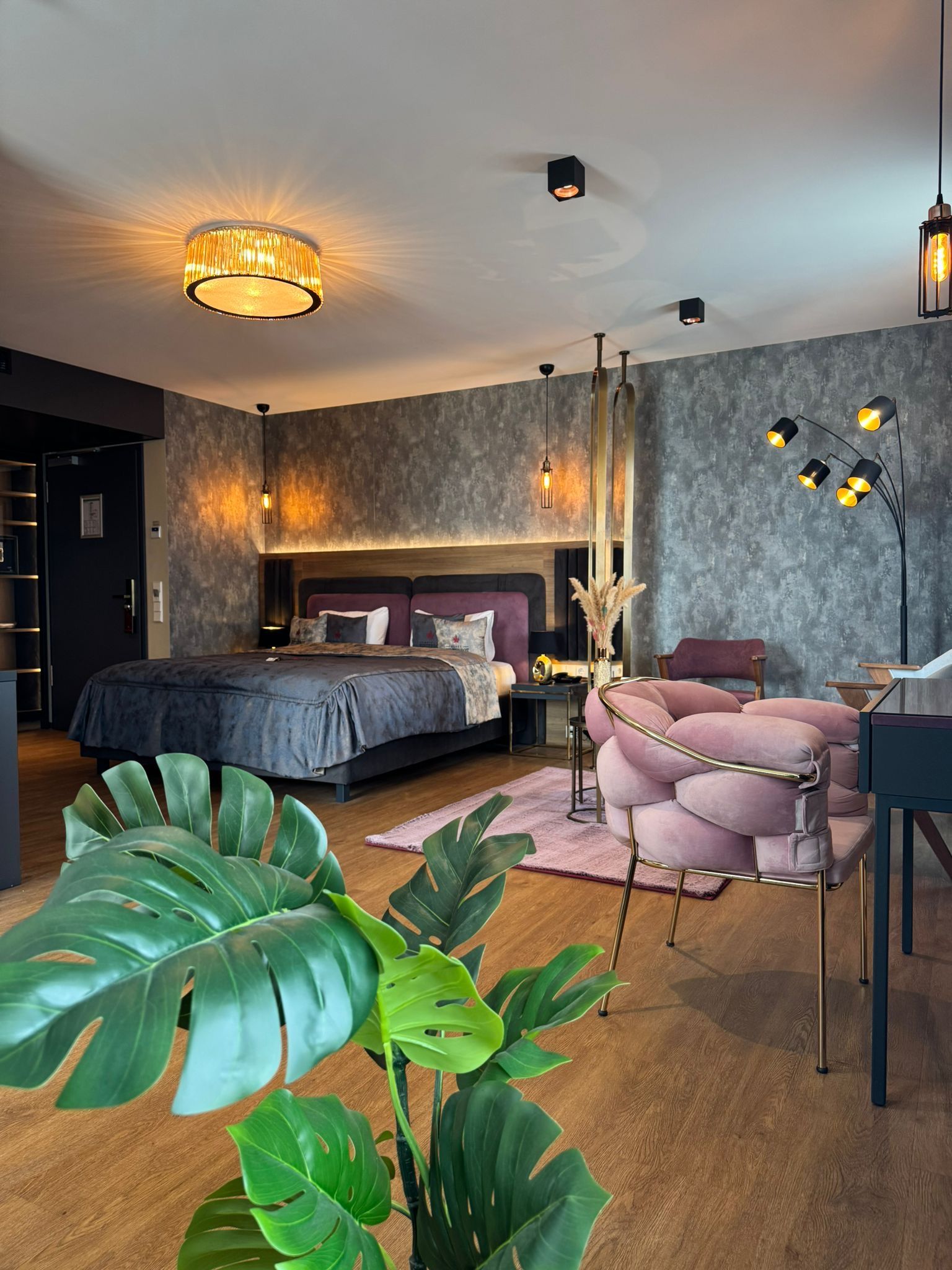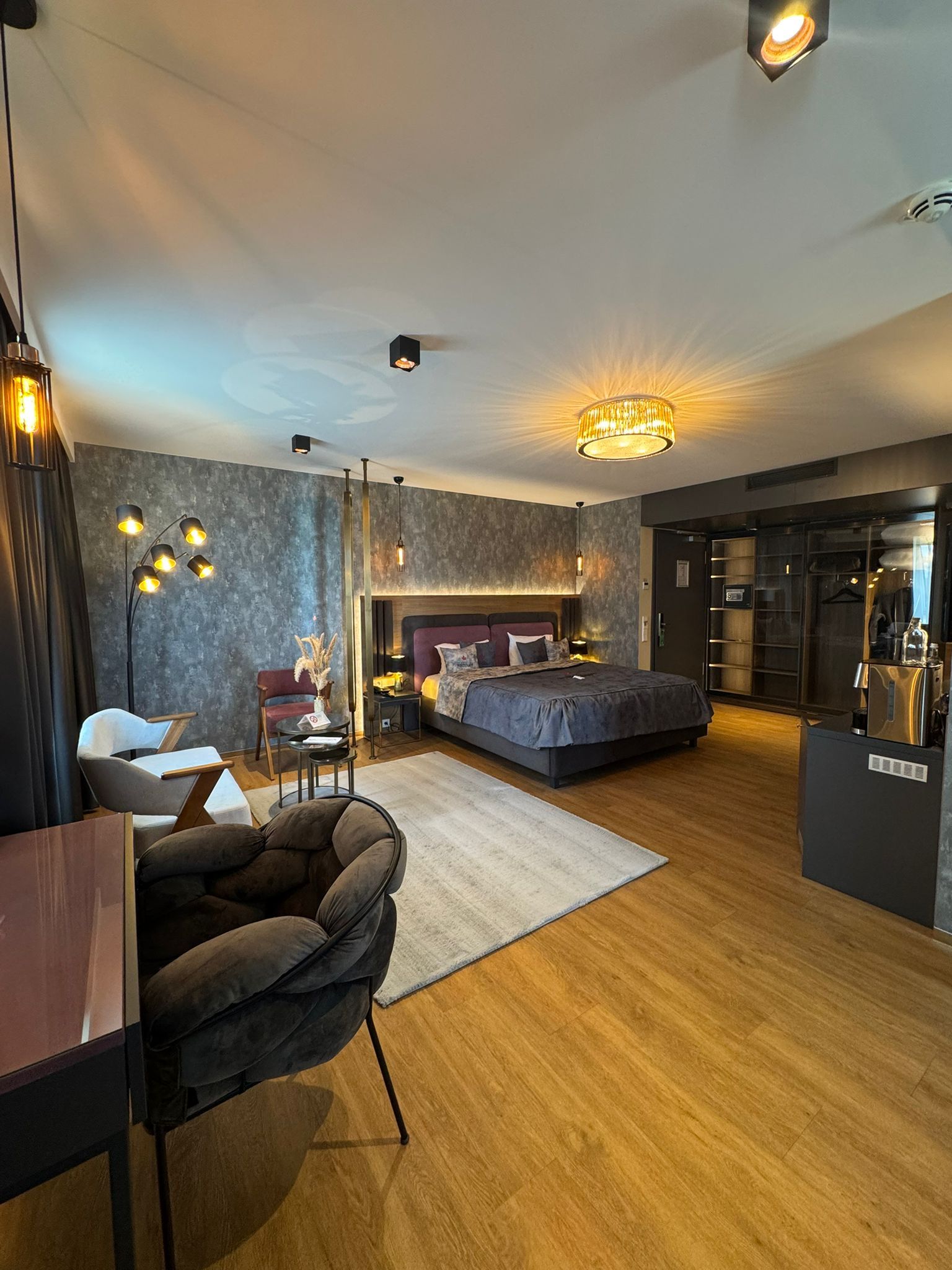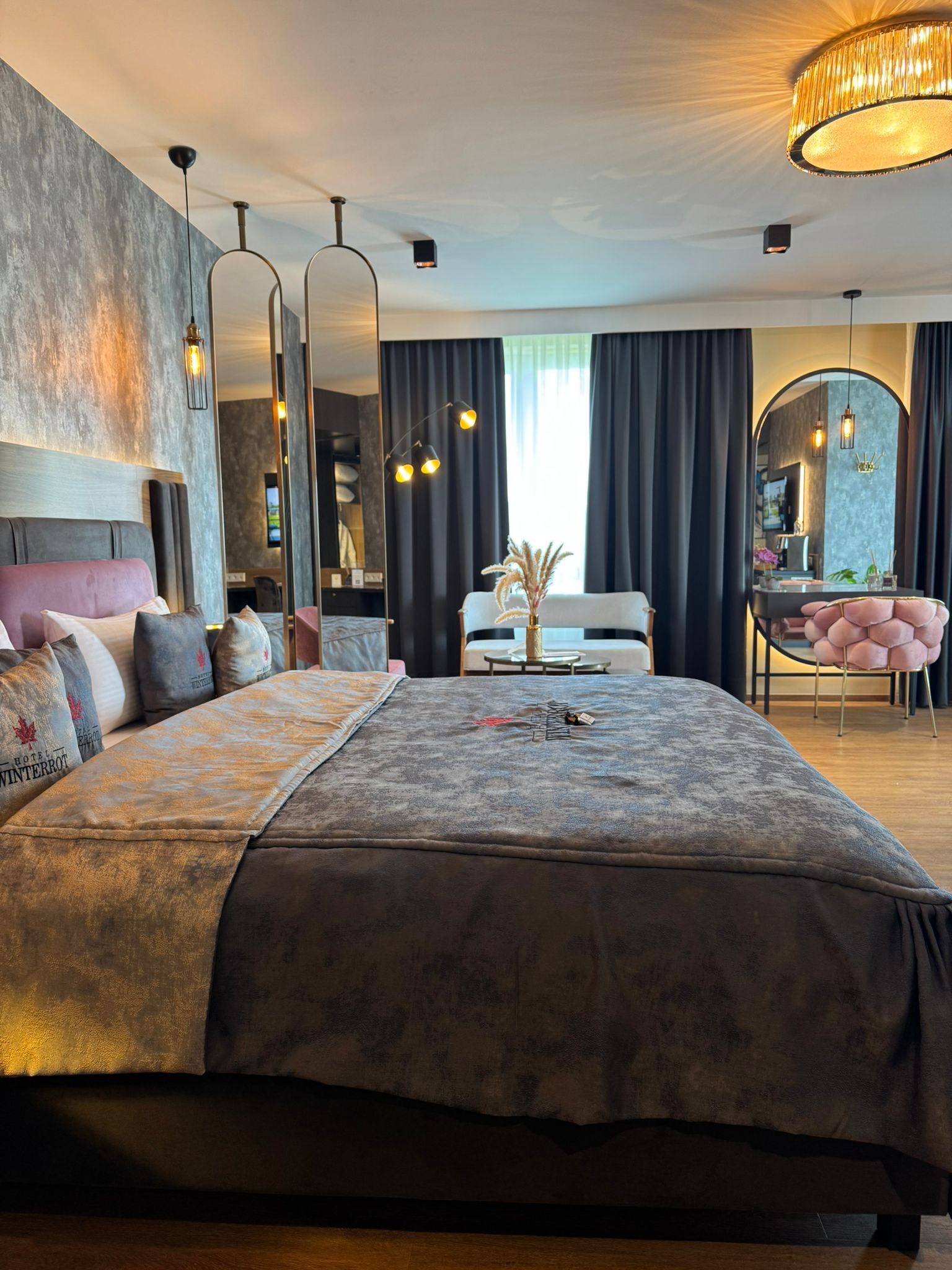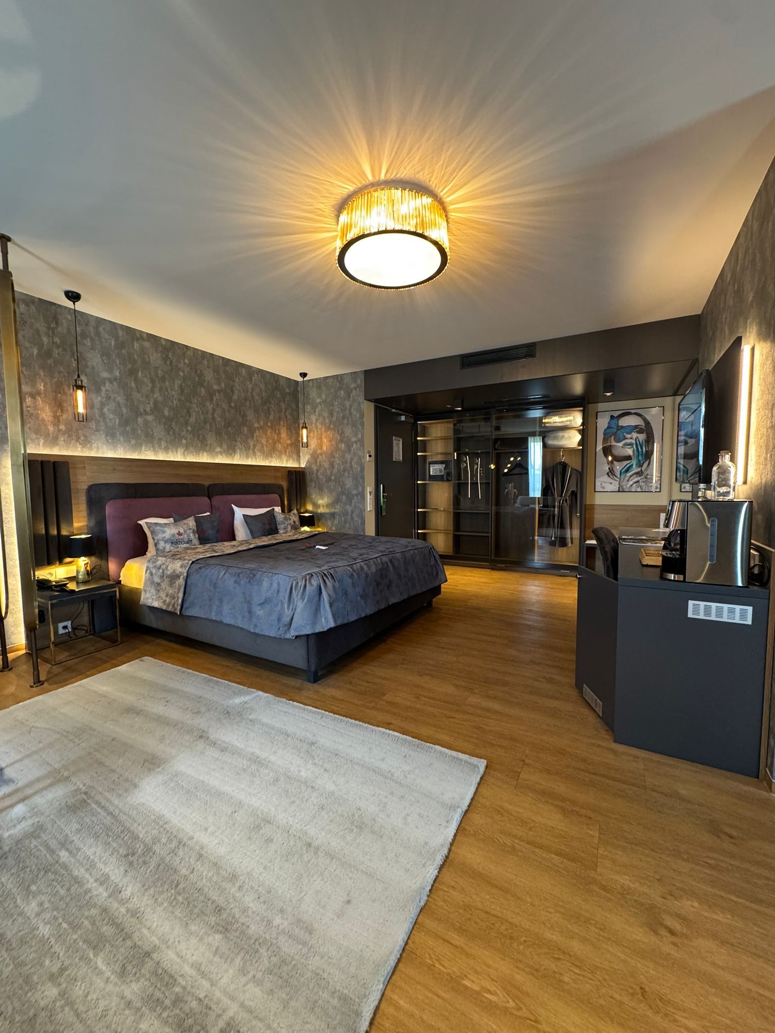 Unsere VIP Platin Zimmer sind das Aushängeschild des Hauses: 45 m² pure Eleganz, ausgesuchte Materialien, ein Ambiente wie im Designmagazin. Erleben Sie einen Aufenthalt, der durchdacht, ruhig und luxuriös zugleich ist. Die Kombination aus freistehender Badewanne, großzügigem Bad, Kingsize-Bett und separatem Wohnbereich schafft ein echtes Suite-Gefühl.